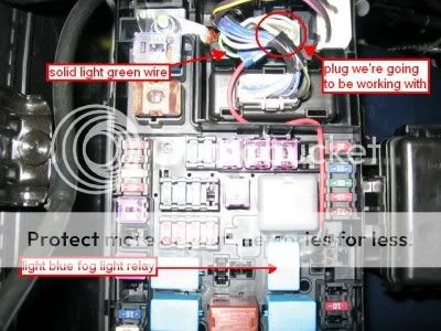 Basically what you’re doing here is removing the light blue fog light relay which is located in the center/right side of the fuse panel under the 1”x1” light gray relay. Once you’ve found the correct light blue relay, remove it and bend over the TOP RIGHT PIN of the replay. Add a female butt connector to the end of your spare wire and plug it into the pin that you’ve bent over from your relay… Plug your relay back into its location. Now, run your wire up towards the top of the fuse panel. You’ll notice you’ll have to go through a thin wall of black plastic to gain access into the location of the three plugs. Drill your small hole so you can continue to run your wire to the 6-pin small white plug that we’re aiming for. Once you’ve got your wire up near the 6-pin plug, locate the SOLID GREEN WIRE which is the top left corner of the actual plug. Use your female splice connector/male butt connector to splice your additional wire into the SOLID GREEN WIRE. Now you’re finished with the fog light modification. Place your fuse panels cover back on and enjoy your new free mod.